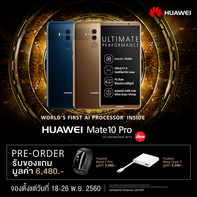 Huawei Mate 10 Pro รุ่นที่นำมาจำหน่ายในประเทศไทย จะเป็นรุ่น RAM 6GB, หน่วยความจำ 128GB (ไม่รองรับ MicroSD) ราคาเปิดตัว 27,900 บาท สั่งจองล่วงหน้าตั้งแต่วันที่ 18 - 26 พฤศจิกายน 2560 จะได้รับของแถมตามนี้ คือ Huawei Brand 2 Pro สายรัดข้อมือเพื่อสุขภาพรุ่นใหม่ล่าสุด มูลค่า 3,990 บาท และ Huawei Mate Dock 2 อุปกรณ์เชื่อมต่อจออิเล็กทรอนิกส์ มูลค่า 2,490 บาท พร้อมของแถมและโปรโมชั่นสุดพิเศษจากทั้ง 3 เครือข่ายยักษ์ใหญ่ AIS, TrueMove H และ dtac สามารถไปอ่านเพิ่มเติมได้ทางลิงก์นี้ครับ