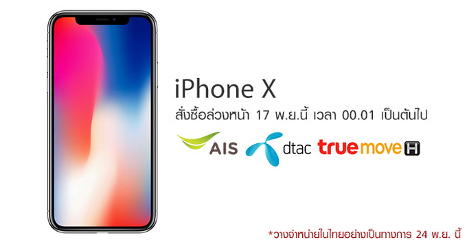 iPhone X วางจำหน่ายในประเทศไทย 2 ความจุได้แก่ 64GB ราคา 40,500 บาท และความจุ 256GB ราคา 46,500 บาท สามารถสั่งซื้อได้ที่ www.apple.com หรือซื้อกับทาง 3 เครือข่ายยักษ์ใหญ่ AIS, TrueMove H และ dtac โดยจะวางจำหน่ายอย่างเป็นทางการตามศูนย์บริการต่างๆ ในวันที่ 24 พฤศจิกายน 2560 ได้ตามลิงก์นี้ครับ