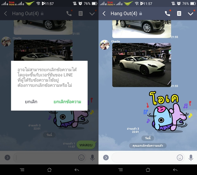 2. จากนั้นยืนยันคำสั่ง "ยกเลิกข้อความ" เพียงแค่นี้ข้อความของคุณก็จะหายไปแล้วครับ แต่มันจะมี "ข้อความแจ้งเตือน" ว่าเรายกเลิกข้อความเอาไว้ ซึ่งไม่สามารถลบได้นะครับ แต่จากการทดสอบถ้าเรายกเลิกเร็วพอ ฝ่ายตรงข้ามจะไม่เห็นข้อความแจ้งเตือนครับ
