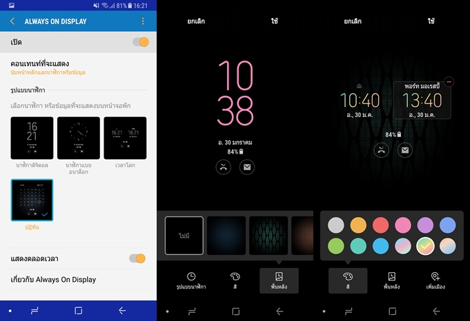Samsung Galaxy A8 (2018) พร้อมรองรับ Always-on display ตรงปุ่ม Home เสมือนจะไม่ใช่ 3D Touch แบบรุ่นใหญ่นะครับ แต่ออกแบบให้แตะ 2 ครั้งเพื่อปลดล็อคหน้าจอได้ สำหรับฟีเจอร์ Always-on display ก็คือจะสามารถแสดงคอนเทนต์บนหน้าจอได้ตลอดเวลา หรือจะตั้งเวลาในการแสดงคอนเทนต์ตามที่เราจะกำหนดก็ได้ โดยจะมีให้เลือก 4 รูปแบบ สามารถปรับแต่งได้อย่างอิสระ และสามารถแสดงการใช้งานตัวควบคุมฟีเจอร์ต่างๆ เช่น เครื่องเล่นเพลง แบบภาพตัวอย่างเลยครับ