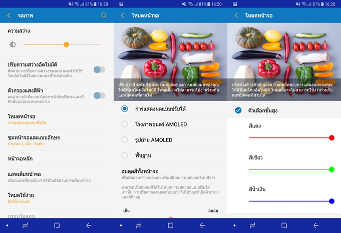 Samsung Galaxy A8 (2018) มาพร้อมฟีเจอร์กรองแสงสีฟ้าเพื่อช่วยถนอมสายตา และสามารถปรับความสดใสของหน้าจอได้อีก 4 รูปแบบ รองรับการใช้งาน Multi Window (การแบ่งหน้าจอ) โดยการแตะค้างที่ปุ่ม Recent app หรือลากนิ้วในแนวทแยงจากมุมหน้าจอ เพื่อย่อหน้าต่างลงมา โดยสามารถปรับให้กลายเป็นไอค่อนบนหน้าจอได้ด้วย ใช้งานได้ง่ายและลื่นไหลดีมาก และสามารถใช้งานมือเดียวเป็นการย่อหน้าจอลงมา โดยลากนิ้วในแนวทแยงจากด้านล่างไปที่กลางหน้าจอ