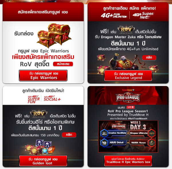 เอาใจเหล่าเกมเมอร์ชาวไทย มันส์ไร้ขีดจำกัดกับเกมสุดฮิต RoV เล่นฟรีไม่อั้น ไม่เสียค่าเน็ต พร้อมรับไอเท็มสุดฮอต สิทธิพิเศษสำหรับลูกค้าแบบเติมเงินที่ซื้อซิมโซเชียลพลัส หรือซิมซูเปอร์ฟัน และลูกค้าแบบรายเดือนที่เปิดเบอร์ใหม่ ย้ายค่ายเบอร์เดิม รวมถึงเปลี่ยนจากเติมเงินเป็นรายเดือน พร้อมสมัครแพ็กเกจ 4G+ Fun Unlimited 299 หรือ แพ็กเกจ 4G+ Fun Unlimited 899 ขึ้นไป รับเพิ่มกล่อง TrueMove H Exclusive Legend จากเกม RoV ฟรี! ตั้งแต่วันนี้ - 30 เมษายน นี้