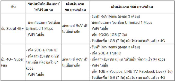 รายละเอียดซิมโซเชียลพลัส หรือ ซิมซูเปอร์ฟัน สำหรับลูกค้าระบบเติมเงิน