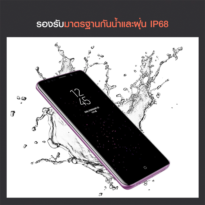 Samsung Galaxy S9 และ Samsung Galaxy S9+ มาพร้อมมาตรฐานกันน้ำ และฝุ่น IP68 โดยสามารถอยู่ในน้ำความลึก 1.5 เมตร ได้นาน 30 นาที และป้องกันฝุ่นละอองได้ แต่ขอเตือนนะครับถ้าเกิดน้ำเข้าขึ้นมาประกันสิ้นสุดทันที (เป็นทุกแบรนด์เลยครับ) ผมว่ามีไว้เผื่อเจออุบัติเหตุก็พอนะครับ ไม่ควรใช้งานใต้น้ำอย่างจริงจัง เพราะประกันไม่ครอบคลุม