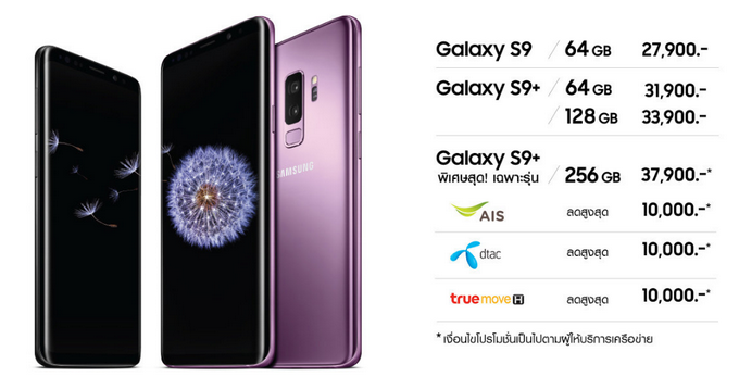 - Samsung Galaxy S9+ 256GB ราคา 37,900 บาท (เฉพาะช่องทางของพาร์ทเนอร์ผู้ให้บริการเครือข่าย)