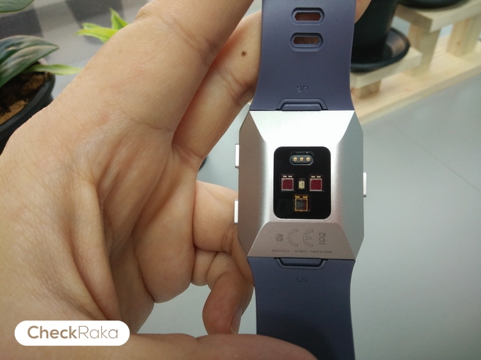 ด้านหลังตัวเรือนจะมีเซ็นเซอร์วัดอัตราการเต้นของหัวใจ กับเซ็นเซอร์ตรวจวัดความอิ่มตัวของออกซิเจนในเลือดสัมพัทธ์ และพอร์ทชาร์จแบตเตอรี่ โดยตัวเรือนของ Fitbit Ionic จะมีปุ่มควบคุม 3 ปุ่ม ด้านซ้ายจะเป็นปุ่ม Home ส่วนด้านขวา 2 ปุ่มจะเป็นปุ่ม Back และ Enter