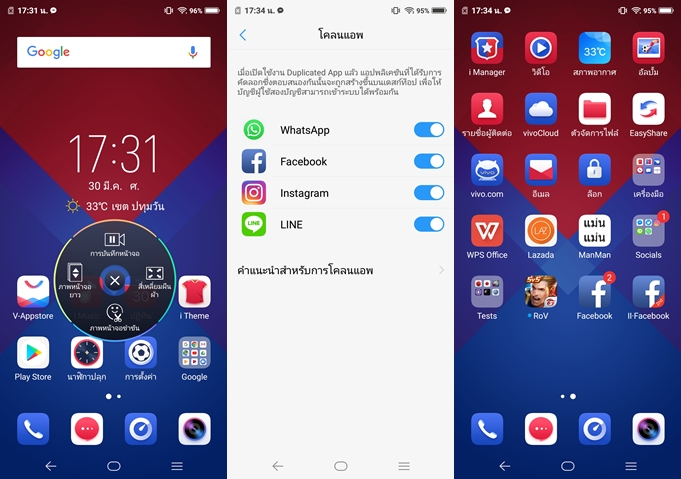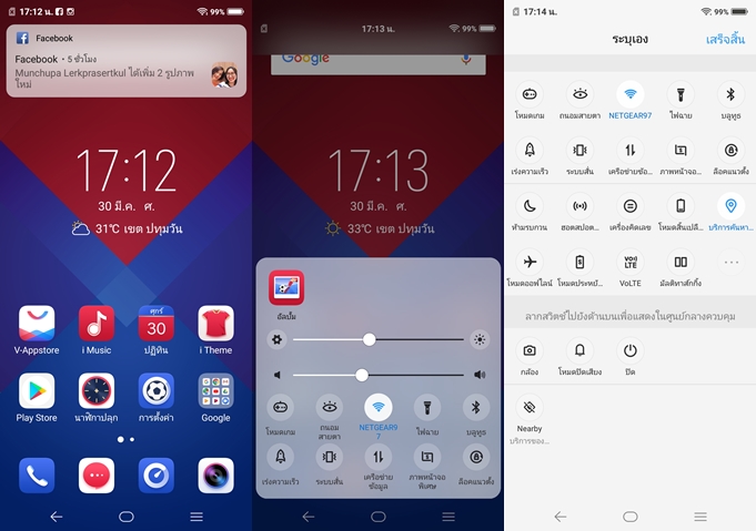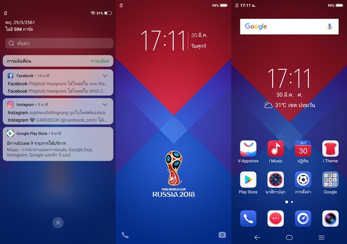 Vivo V9 มาพร้อมมาตรฐานใหม่อัตราส่วน 19:9 มีติ่งที่หน้าจอ โดยรวมหน้าตา UI ยังคล้ายเดิมครับ สำหรับรุ่นนี้ทำงานบน Android 8.1 Oreo ครอบทับด้วย FunTouch OS 4.0 ด้วยลักษณะหน้าจอแบบนี้ทำให้ดูเต็มตามากขึ้น ติ่งหน้าจอก็ไม่ค่อยรู้สึกเกะกะเพราะมีขนาดเล็ก ความเร็วและความลื่นไหลทำได้ดีครับ จะติก็ตรงมีปัญหาในการใช้งานแนวนอนเพราะมันจะไม่เต็มจอ จะมีการตัดขอบด้านข้าง กลายเป็นว่าแสดงผลเหมือนหน้าจอ 16:9 ตามปกติเลย ซึ่งน่าจะเป็นเพราะแอปพลิเคชั่นไม่รองรับครับ ต้องรอการอัพเดทจากแอปต่างๆก่อน เชื่อว่าสมาร์ทโฟนระบบ Android ที่ใช้หน้าจอ 19:9 มีติ่งหน้าจอแบบนี้น่าจะโดนหางเลขกันหมด (ล่าสุด Vivo ออกแบบธีม Fifa World Cup Russia 2018 มาให้ใช้กันด้วยนะครับ สวยมากๆ)