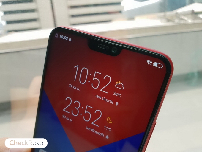 Vivo V9 สีแดง ยังคงมาพร้อมหน้าจอ FullView อัตราส่วน 19:9 ขนาด 6.3 นิ้ว ความละเอียดสูงขึ้น Full HD+ ขอบจอบางเฉียบ ติ่งหน้าจอมีขนาดเล็ก หน้าจอสวยมากครับ สีสันสดใส บริเวณติ่งหน้าจอจะประกอบด้วยกล้องหน้าความละเอียดสูง 24MP F2.0 ที่มาพร้อม AI Face Beauty และบันทึกวีดีโอ 4K, ลำโพงสนทนา และเซ็นเซอร์ สำหรับรุ่นนี้มี ฟีเจอร์สแกนใบหน้า AI Face Access ด้วยนะครับ