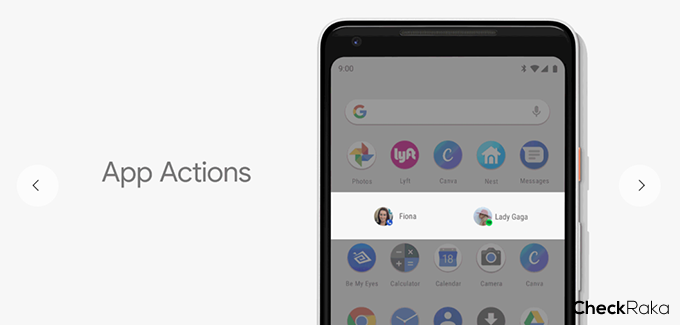 ฟีเจอร์ที่จะเสมือนเป็นเพื่อนที่รู้ใจ เพื่อให้คุณใช้งานแอปพลิเคชั่นต่างๆ ได้ง่ายและเร็วมากขึ้น โดย App Action จะนำเสนอความต้องการในการใช้งานที่ต่อเนื่องกันจากพฤติกรรมการใช้งานของผู้ใช้ เช่น เมือเราเสียบหูฟังเข้าที่ตัวเครื่อง ตัวระบบก็จะนำเสนอแอปพลิเคชั่นด้าน Music อย่าง Spotify, Apple Music ขึ้นมาให้เลือกใช้งาน แต่!! App Action ไม่ได้มาส่งคุณแค่ตรงนี้ เพราะตัวระบบยังเรียนรู้ไปถึงพฤติกรรมการเรียก Playlist หรือฟังก์ชั่นที่ใช้งานบ่อยๆ ภายในแอปฯ นั้นๆ ได้ด้วย ซึ่ง App Action จะถูกนำไปใช้งานทั่วทั้ง OS ในหลายๆ ส่วน เช่น SmartText, Launcher, Google Play Store หรือ Google Assistance