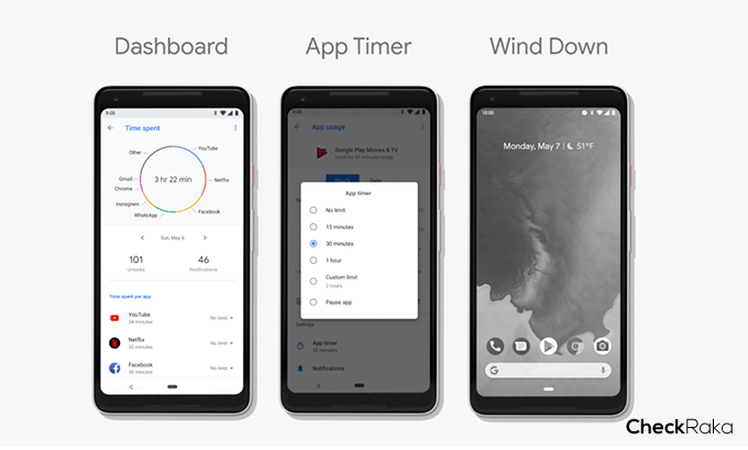 Google กล่าวว่า เทคโนโลยีก็มีข้อดี แต่มันก็ไม่ควรทำให้คุณเสียสมาธิ (เสียเวลา) มากเกินไป ดังนั้น Google จึงได้เพิ่มฟีเจอร์ใหม่เข้ามาบน Android P เพื่อให้ผู้ใช้งานควบคุมการใช้งานสมาร์ทโฟนของตัวเองไม่ให้นานจนเกินพอดี และทำให้มีเวลาทำงานได้ตรงตามเป้าหมายที่วางไว้ โดยฟีเจอร์ที่เพิ่มเข้ามาช่วยในเรื่องนี้ ประกอบด้วย