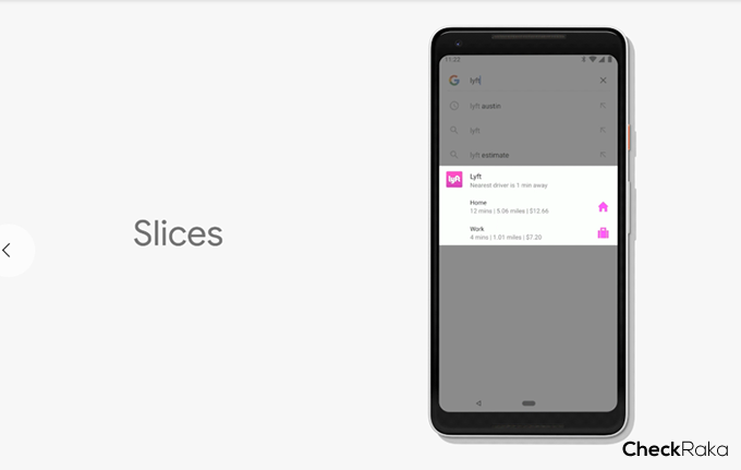เป็นฟีเจอร์ที่ทำให้เราสั่งการหรือใช้งานแอปพลิเคชั่นต่างๆ ได้ง่ายยิ่งขึ้น เพื่อให้ผู้ใช้เรียกใช้สิ่งที่ต้องการได้เร็วกว่าเดิม เช่น ในตัวอย่างของ Google ผู้ใช้ค้นหาบริการ "Lyft" จาก Google Search ซึ่งเป็นบริการเรียกรถโดยสารคล้าย Grab ในบ้านเรา และเมื่อค้นเจอฟีเจอร์ Slices ก็จะนำเสนอคำสั่งที่เราเรียกใช้งานบ่อยๆ หรือระบบคาดเดาว่าเราน่าจะใช้งานจะการค้นหาขึ้นมาให้ทันที ในตัวอย่างก็จะนำเสนอ Location อย่างที่ทำงานหรือบ้านขึ้นมาให้ทันที