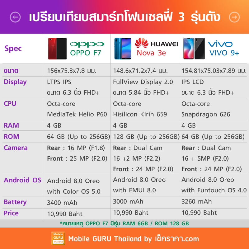 เปรียบเทียบสเปคของ Huawei Nova 3e กับ OPPO F7 และ VIVO V9