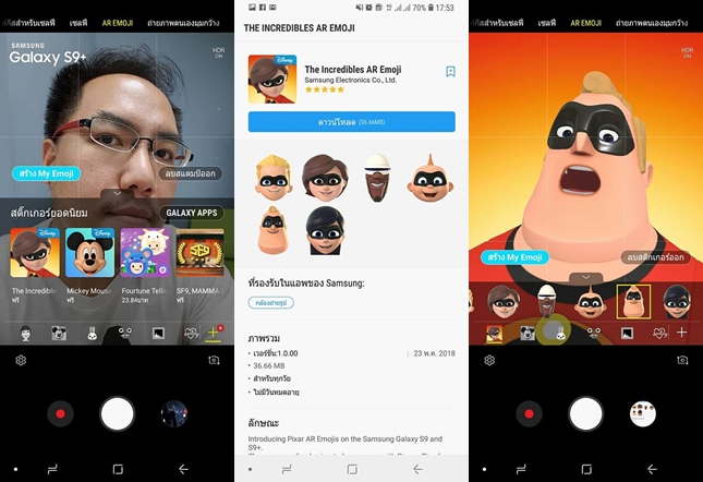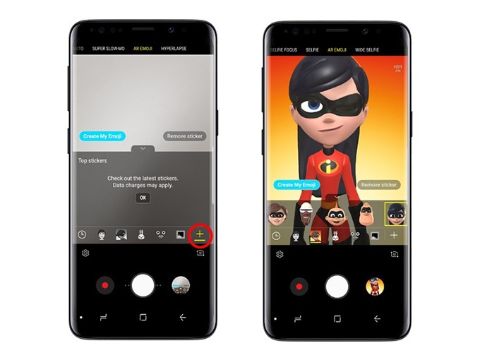 ผู้ใช้งานสมาร์ทโฟน Samsung Galaxy S9 และ Galaxy S9+ สามารถสนุกได้ก่อนใคร โดยส่งข้อความผ่าน อาวาตาร์ที่เป็นตัวการ์ตูนอย่าง Mr. Incredible, Elastigirl, Violet, Dash, Jack-Jack และ Frozone ง่ายๆ เพียงเข้าไปที่กล้องถ่ายรูปในโหมด AR Emoji จากนั้นกดเข้าไปที่ปุ่มพลัส (+) ตรงขวามือของกล้อง และเลือกแพ็คเกจ The Incredibles AR Emoji Pack จาก แอปพลิเคชั่น Galaxy App Store