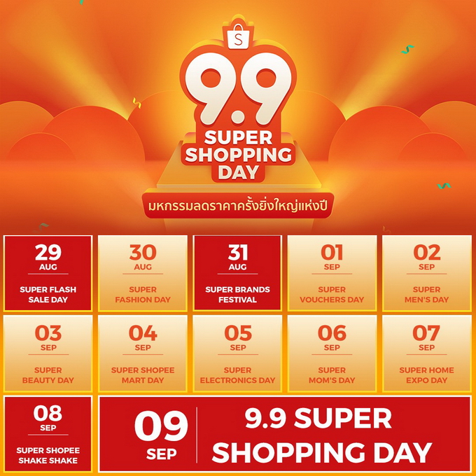 Shopee ผู้นำแพลทฟอร์มอีคอมเมิร์ซ ในภูมิภาคเอเซียตะวันออกเฉียงใต้ และไต้หวัน เปิดตัวมหกรรมลดราคาครั้งยิ่งใหญ่ที่สุดแห่งปีกับ Shopee 9.9 Super Shopping Day เทศกาลช้อปปิ้งที่ใหญ่ที่สุดในภูมิภาค หลังจากประสบความสำเร็จเมื่อปีที่แล้วโดยการสร้างสถิติใหม่ ที่มียอดสั่งสินค้าเพิ่มขึ้นถึง 3 เท่า และมียอดผู้เข้าชมสินค้าต่อวันเพิ่มขึ้นเป็น 5 เท่า ปีนี้ช้อปปี้ยกระดับ ความพิเศษกับซูเปอร์ธีมเดย์ แคมเปญลดราคาตลอด 12 วัน ตั้งแต่วันที่ 29 สิงหาคม ถึง 9 กันยายนนี้ โดยร่วมมือกับ ร้านค้ากว่า 800,000 ร้าน แบรนด์สินค้าชั้นนำร่วมพันแบรนด์ และแบรนด์พันธมิตร กว่า 60 แบรนด์ อาทิ Unilever, Philips, L'Oreal Paris ,La Roche Posay, LG, 3M, Enfagrow และ Mamypoko เพื่อมอบโปรโมชั่นแบบน็อนสต็อป ไม่ว่าจะเป็นสินค้าราคาแฟลชเซลล์ ในราคาที่ไม่มีที่ไหน เทียบได้ หรือโปรโมชั่นลดราคาสูงสุดถึง 90% ครอบคลุมหลากหลายกลุ่มผลิตภัณฑ์