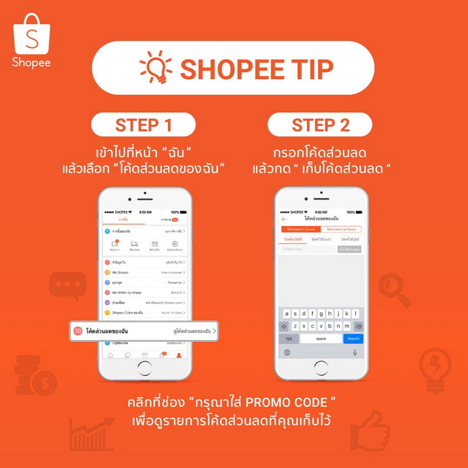- VOUCHER CODE/PROMO CODE: โค้ดส่วนลดที่หลายคนคุ้นเคย ซึ่งสามารถสะสมได้จากการกดรับจากในแอพ ตัวโค้ดจะมีทั้งรูปแบบส่วนลดสินค้าและฟรีค่าจัดส่ง เมื่อได้โค้ดมาแล้วก็สามารถนำไปใส่ช่องโค้ดส่วนลด ก่อนที่จะกดชำระเงินได้ทันที (1 การสั่งสื้อเลือกใช้ได้ 1 โค้ดเท่านั้น)
