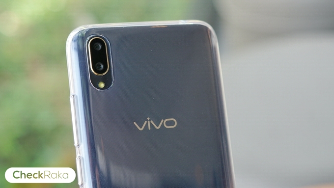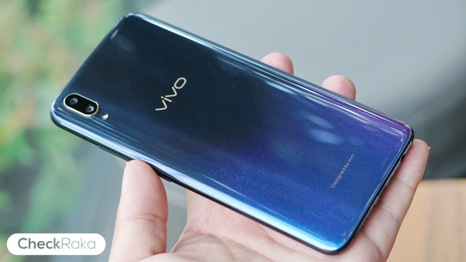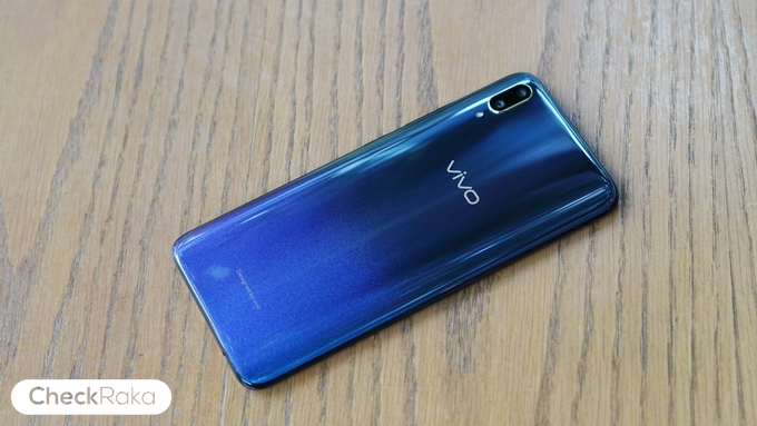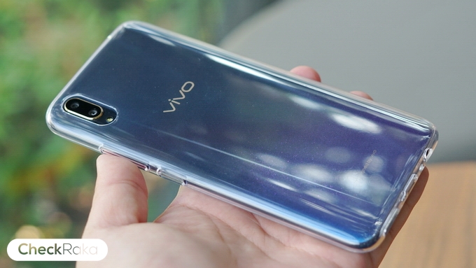 ด้านหลังใช้วัสดุพลาสติกโพลีคาร์บอเนต ไล่เฉดสีและมีประกายแวววาวสวยงามมากๆ ตัวเครื่องบางเพียง 7.9 มม. และมีน้ำหนักเบา 156 กรัมเท่านั้น การจับถือให้ความรู้สึกที่ดีมากๆ ด้านฝาหลังโค้งรับกับฝ่ามือและไม่มีแกนกลาง ด้านหลังมีกล้องคู่ความละเอียด 12MP F1.8 + 5MP F2.4, Dual Pixel PDAF ขอบกล้องจะเป็นโลหะสีทอง และไฟแฟลช LED ตรงกลางมีโลโก้ Vivo และด้านล่างมีข้อความว่า Designed by Vivo