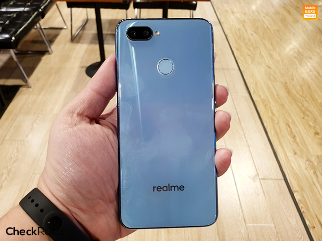 ด้านหลังตัวเครื่องเคลือบลามิเนต 15 ชั้น ให้ผิวสัมผัสมันวาวเหมือนกระจก ขยับขึ้นไปที่มุมซ้ายบนจะมีเลนส์กล้องคู่ความละเอียด 16+2 ล้านพิกเซล พร้อมไฟแฟลช LED ในขณะที่ตรงกลางจะมีแป้นสัมผัสสำหรับสแกนลายนิ้วมือ และมีโลโก้ 'Realme' อยู่ด้านล่าง