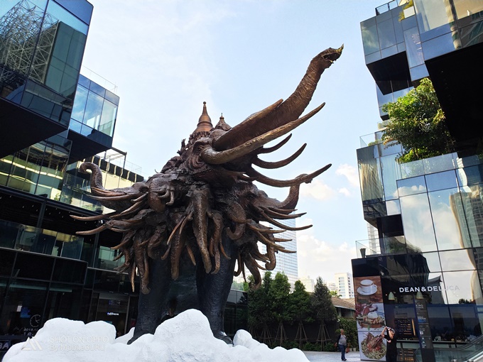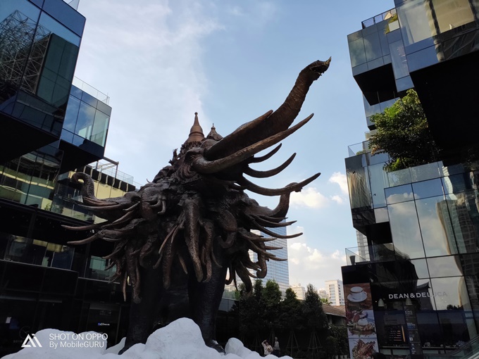 เราเริ่มทดสอบกันที่ด้านนอกตึกมหานครกันก่อนเลย กับสภาพแสงยามเย็นประมาณ 16.30 น. โดยเลือกรูปปั้นช้างเอราวัณที่ว่ากันว่าถูกนำมาตั้งไว้เพื่อแก้หลักฮวงจุ้ยของตึก ซึ่งรูปปั้นจะตั้งอยู่ในทิศทางย้อนแสงยามเย็นพอสมควร เลยได้โอกาสลองประสิทธิภาพโหมดถ่ายภาพ HDR ของ OPPO R17 Pro กันซะหน่อย และลองใช้โหมด PI ที่เป็นโหมดไฮไลท์ของกล้องรุ่นนี้ กับคุณสมบัติการคืนสภาพสีสันของภาพถ่ายให้สวยเหมือนจริงไปในตัวด้วย ไปดูภาพที่ได้กันครับ