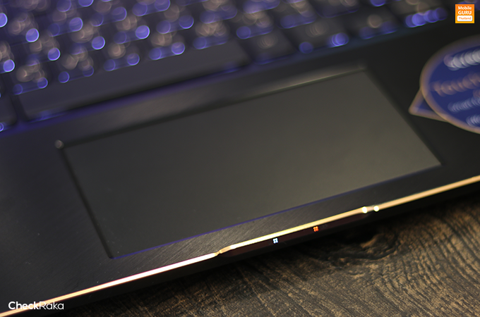 แป้นพิมพ์คีย์บอร์ด บริเวณด้านในจะเป็นแผ่นโลหะขัดลายดูพรีเมี่ยม มีการเสริมลูกเล่นด้วยการตัดขอบสุดหรู Diamond Cut โทนสีทองอ่อน เพื่อให้ดูเรียบหรูมากขึ้น และเยื้องมาด้านขวาใต้แป้นพิมพ์จะแป้นสัมผัสสำหรับสแกนลายนิ้วมือ เพื่อยืนยันตัวตนในการใช้งาน และรุ่นนี้ใช้ลำโพงของแบรนด์ด้านเครื่องเสียงระดับโลก Harman/Kardon