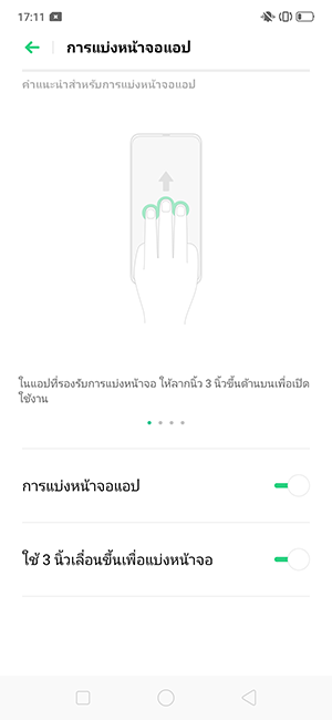 Multi-app (การแบ่งหน้าจอแอป): เป็นการใช้งานแอปพลิเคชั่นพร้อมกันสองแอปฯ บนหน้าจอเดียวกัน ทำให้สามารถดูยูทูปไปพร้อมกับเล่นเฟสก็ได้ ซึ่งแน่นอนก็ยังคงใช้งานได้เหมือนเดิม รวมทั้งยังเรียกใช้งานเหมือนเดิมด้วยเช่นกัน กับการใช้ 3 นิ้ว ลากขึ้นด้านบน ก็จะเข้าสู่หน้าจอแบ่งแอปพลิเคชั่นทันที