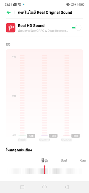ระบบเสียง Real HD Sound เป็นซอฟต์แวร์ปรับเสียง (EQ) ที่ทางออปโป้จับมือกับ Dirac พัฒนาขึ้นมา ซึ่งจากการใช้งานจริงจัง ส่วนตัวค่อนข้างประทับใจพอสมควร เพราะจากการลองนำไปใช้งานกับหูฟัง AKG และเปิดฟังเพลงผ่านแอปพลิเคชั่น JOOX โดยเลือกเสียงคุณภาพระดับ Medium เสียงที่ขับออกมาจากการเปิดใช้โหมดนี้ กลับให้เสียงที่มีมิติขึ้นจากต้นฉบับในระดับหนึ่งเลย เบสมาแน่นแต่ไม่อึดอัดมากนัก