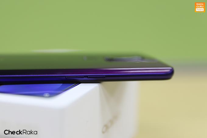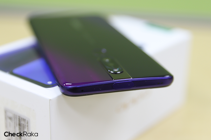 ด้านหลังของตัวเครื่อง มีกล้องคู่ความละเอียดสูง 48+5 ล้านพิกเซล พร้อมไฟแฟลช LED และแป้นสัมผัสสำหรับสแกนลายนิ้วมือ ส่วนด้านล่างมีโลโก้ OPPO ที่มีการปรับดีไซน์ให้ดูพรีเมี่ยมมากขึ้น
