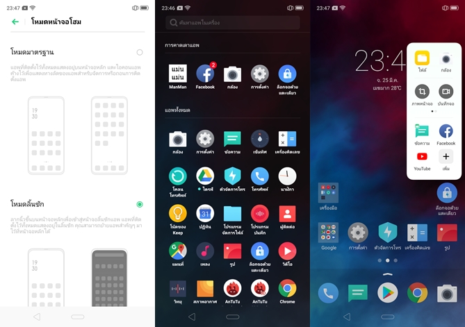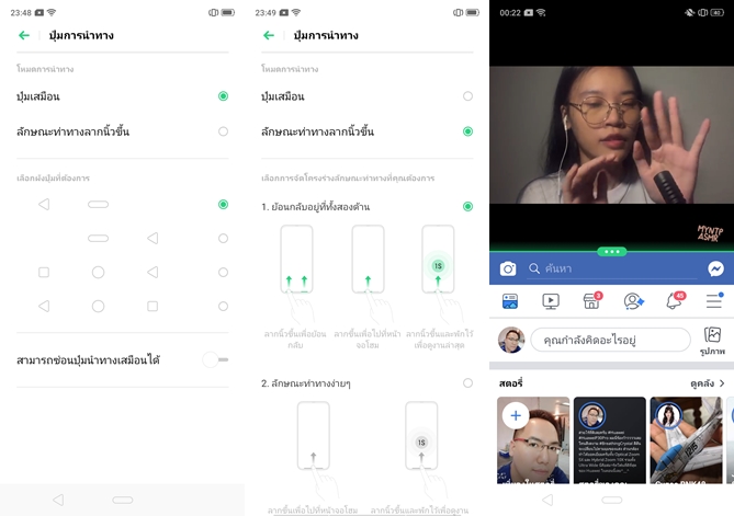 ปุ่มนำทางด้านล่างมีให้เลือก 4 รูปแบบ สามารถซ่อนได้ครับ และเลือกใช้ Gesture ในการควบคุมการทำงานแทนได้อย่างสมบูรณ์แบบ รวมทั้งมาพร้อมฟีเจอร์แถบด้านข้างอัจฉริยะ เรียกใช้งานได้อย่างง่าย โดยการปัดหน้าต่างออกมาจากขอบเครื่องเท่านั้นเอง จะรวมเอาเครื่องมือต่างๆ อย่างเช่น การจับภาพหน้าจอ, การบันทึกภาพหน้าจอแบบวีดีโอ หรือการเปิดใช้งานแอปพลิเคชั่นต่างๆ ได้จากฟีเจอร์นี้ และรองรับการใช้งาน 2 หน้าจอพร้อมกัน App Split-Screen วิธีเปิดใช้งานทำได้หลายวิธีเลยครับ เช่น ใช้นิ้วมือ 3 นิ้วลากหน้าจอขึ้นไปด้านบน, ปัดนิ้วจากด้านล่างเข้าไปในหน้า Multitasking แล้วเลือกแอปพลิเคชั่นที่เราต้องการใช้งานแบ่งหน้าจอ จากการทดสอบการทำงานแบบแบ่งหน้าจอลื่นไหลดีครับ สลับแอปพลิเคชั่นได้อย่างรวดเร็ว