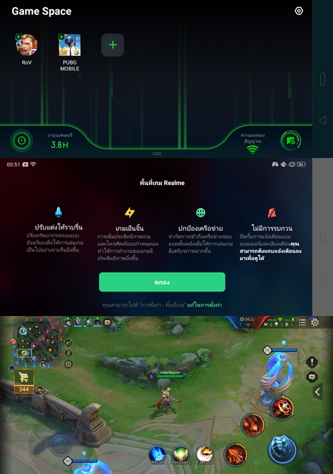 realme 3 จัดเต็มสำหรับคอเกมด้วย Game Space ช่วยอำนวยความสะดวกในการเล่นเกม ปิดกั้นการแจ้งเตือนต่างๆ และเร่งประสิทธิภาพในการเล่นเกม รวมทั้งความแรงของสัญญาณ ทดสอบด้วยเกมดังอย่าง ROV สามารถเล่นได้อย่างลื่นไหลเฟรมเรทอยู่ที่ 5x FPS - 4x FPS สบายๆ จนจบเกม