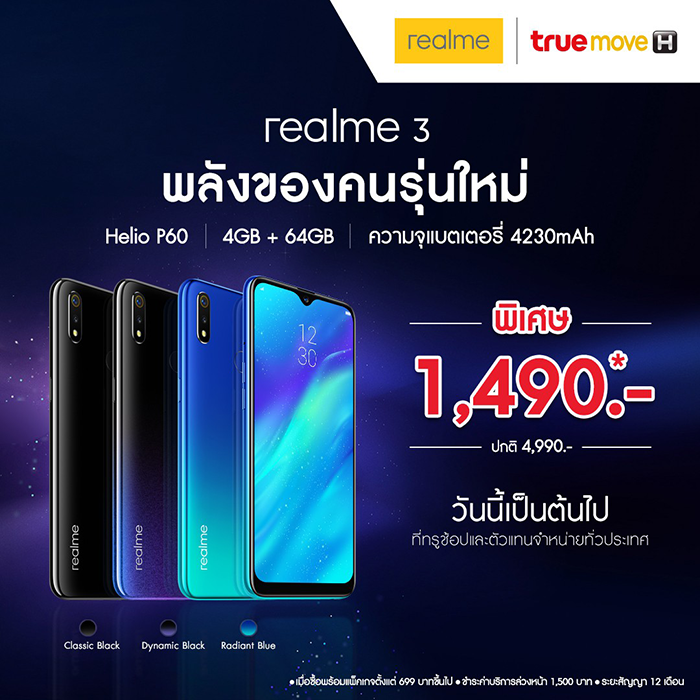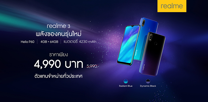 - realme 3 รุ่นความจุ RAM 4GB/ROM 64GB ปรับราคาใหม่ เหลือเพียง 4,990 บาท (จากราคาปกติ 5,990 บาท)