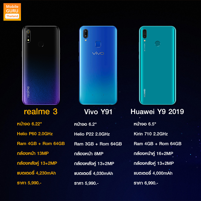 รีวิว สมาร์ทโฟนช่วงราคา 5,000 บาท กับรุ่นยอดฮิต realme 3, Vivo Y91 และ Huawei Y9 2019