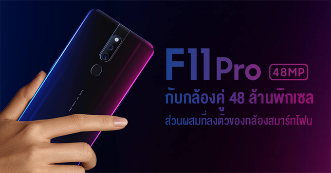 OPPO F11 Pro สมาร์ทโฟนรุ่นใหม่ล่าสุดจากแบรนด์ ออปโป้ มาพร้อมด้วยจุดขายดีไซน์ตัวเครื่องที่สวยงาม มาพร้อมโทนสีสุดพิเศษ Thunder Black และ Aurora Green หน้าจอไร้ขอบสมบูรณ์แบบขนาด 6.53 นิ้ว ความละเอียด Full HD+, ชิปเซ็ตตัวแรง Mediatek Helio P70, กล้องคู่ความละเอียดสูง 48MP F1.79 + 5MP F2.4, กล้องหน้า Pop-Up ความละเอียด 16MP F2.0, มาพร้อมโหมดถ่ายภาพกลางคืน Ultra Night Mode และโหมดเร่งสี Color Mapping พร้อมระบบ AI ซึ่งสามารถจำแนกได้ถึง 23 รูปแบบ, แบตเตอรี่ความจุ 4,000 mAh รองรับชาร์จไว VOOC 3.0 ราคาชวนสัมผัส 10,990 บาท จะเห็นว่าทั้งดีไซน์ และสเปคดูโดดเด่นน่าสนใจทีเดียวครับ และตอนนี้วางจำหน่ายอย่างเป็นทางการแล้วนะครับ เพื่อนๆที่สนใจไปหาซื้อกันได้เลยทั้ง 2 สี