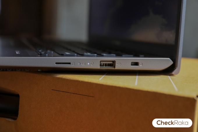 ด้านขวาประกอบด้วย microSD card reader, ไฟแจ้งเตือน, ไฟแจ้งสถานะแบตเตอรี่, USB 2.0 และ Security Slot