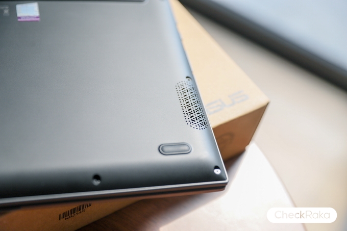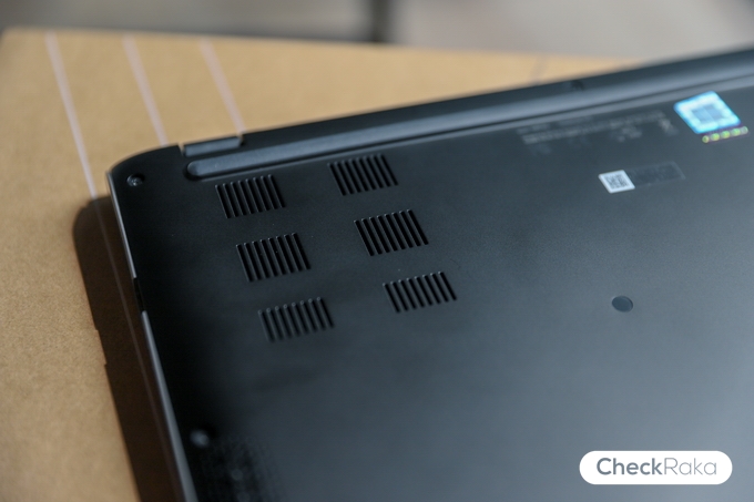 ตัวเครื่องบางเพียง 19.5 มม. เท่านั้น ด้านหน้าดูเรียบๆ มีร่องสำหรับเปิดหน้าจอโน้ตบุ๊ค และด้านหลังจะมีช่องระบายอากาศ และตรงบานพับจะมียางกันชนอยู่ครับ เพราะรองรับกลไกบานพับ ErgoLift