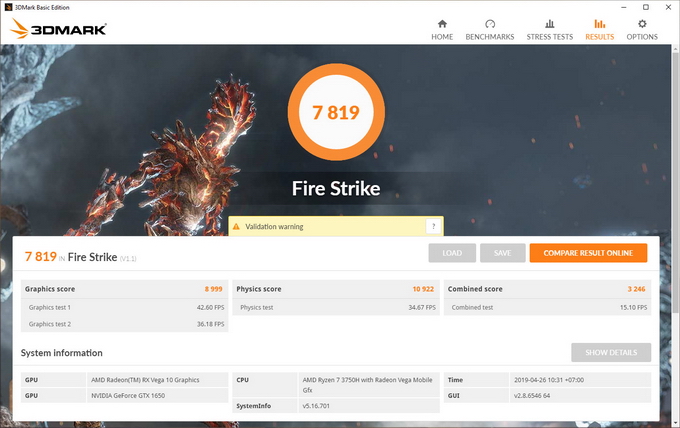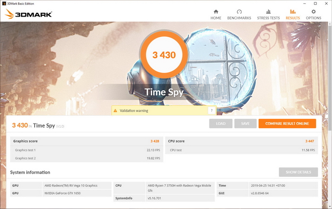 ทดสอบด้วยโปรแกรม 3D Mark ตัว Fire Strike ทำคะแนนอยู่ที่ 7,819 คะแนน และ Time Spy ทำคะแนนอยู่ที่ 3,430 คะแนน
