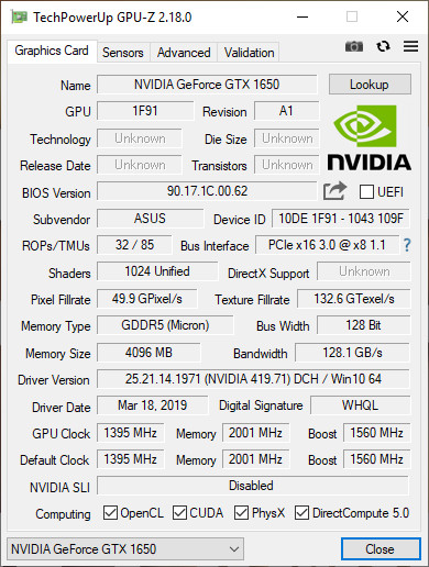- GPU Nvidia GeForce GTX1650 with 4GB GDDR5 VRAM