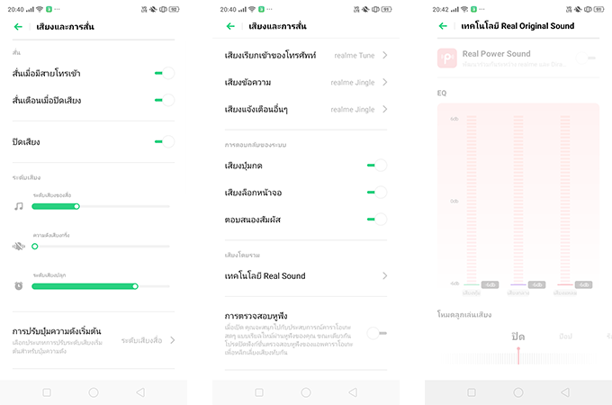 สำหรับด้านความบันเทิง realme C2 ได้ใส่ระบบเสียง Real Original Sound ที่เป็นระบบปรับแต่งเสียง (EQ) ให้ใกล้เคียงกับไฟล์ต้นฉบับมากที่สุดมาให้ด้วย ทำให้เราสามารถเลือกปรับโทนสีในย่านต่างๆ ได้ตามต้องการ ซึ่งตรงนี้ผมว่าโอเคเลยนะสำหรับมือถือ Entry-level แล้วใส่ฟีเจอร์นี้มาให้ด้วย เพราะช่วยให้เรารับฟังเสียงทั้งจากวีดีโอหรือสตรีมมิ่งวีดีโอได้อรรถรสมากขึ้นเยอะเลย และจากการลองใช้งานบอกเลยว่าช่วยได้จริงๆ นะ แนะนำให้ลองปรับกันแล้วจะเห็นโลกอีกใบที่สนุกขึ้นเลยล่ะ