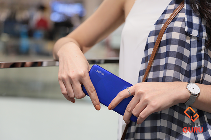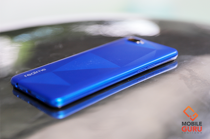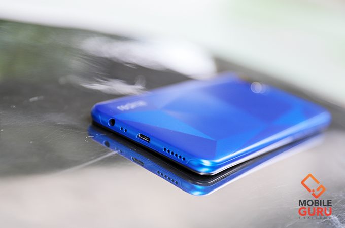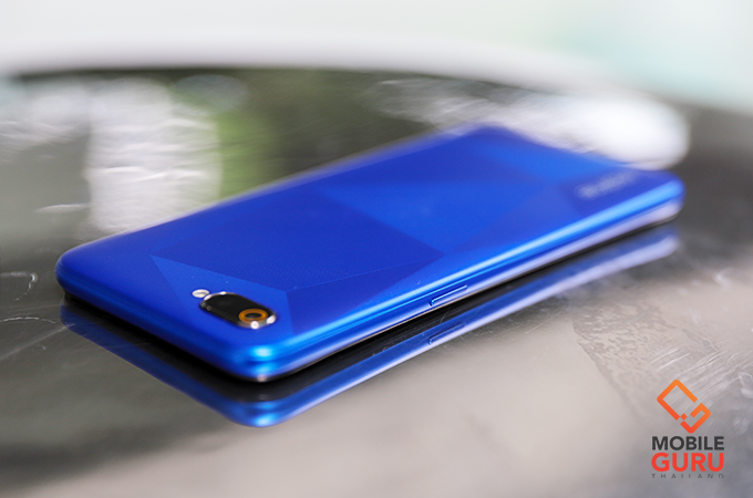 realme C2 มาพร้อมคอนเซ็ปท์การออกแบบตัวเครื่อง "Diamond Cut" ที่มีการนำเทคโนโลยี Laser Cutting มาผสมผสานเข้ากับผงไข่มุก มาเพ้นท์ลงไปบนฝาหลังตัวเครื่องโดยตรงถึง 3 ชั้น จนได้ฝาหลังที่มีลวดลายเหลี่ยมเพชรบน C2 แบบที่เห็น ส่วนผิวสัมผัสก็จะรู้สึกแบบด้าน (Matte) ซึ่งปกติแล้วมือถือส่วนใหญ่มักจะมีกระจกหรือวัสดุอะไรครอบทับปิดการออกแบบเอาไว้ แต่สำหรับ C2 คุณจะได้สัมผัสงานออกแบบโดยตรงที่ฝาหลังได้เลย ซึ่งผมชอบมากๆ เลยล่ะ ในขณะที่มิติตัวเครื่องกว้าง 73.7 x สูง 154.3 x หนา 8.5 มิลลิเมตร และมีน้ำหนักรวมอยู่ที่ประมาณ 166 กรัม