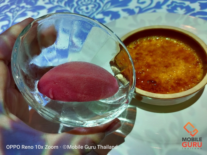 ปิดท้ายด้วยของหวาน โดยเชฟตัวจิ๋วได้พาเรากลับมาที่ France ของหวานจะเป็น Creme Brulee, saffron และ cardamom Ispahan sorbet ก็คือแครมบรูว์เลใส่หญ้าฝรั่น ผิวกรอบๆ ขมนิดๆ ช่างยั่วใจจริงๆ ทานคู่กับซอร์เบทลิ้นจี่ผสมกุหลาบ รสหวานอมเปรี้ยว หอมจนผมรู้สึกเหมือนกำลังทานโคโลญเลยครับ (ไม่ใช่ว่าไม่ดีนะ)