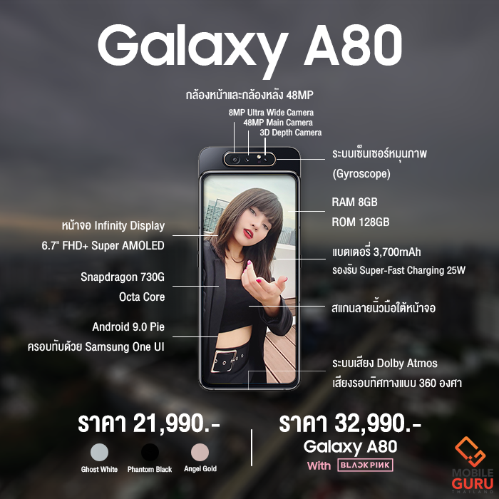 Samsung Galaxy A80 เป็นสมาร์ทโฟนที่ผมเคยเห็นครั้งแรกในงานเปิดตัวอย่างเป็นทางการ เมื่อเดือนเมษายนที่ผ่านมา พร้อมประกาศแบรนด์แอมบาสเดอร์ระดับโลก สาวๆ วง Blackpink เรียกความสนใจทั้งแฟนๆ ชาว Blink และผู้ใช้งานทั่วไปเป็นอย่างมากจนเกิดกระแสร้อนแรง ไม่ใช่เพียงในประเทศไทย แต่ตื่นเต้นกันทั่วโลกเลยละครับ
