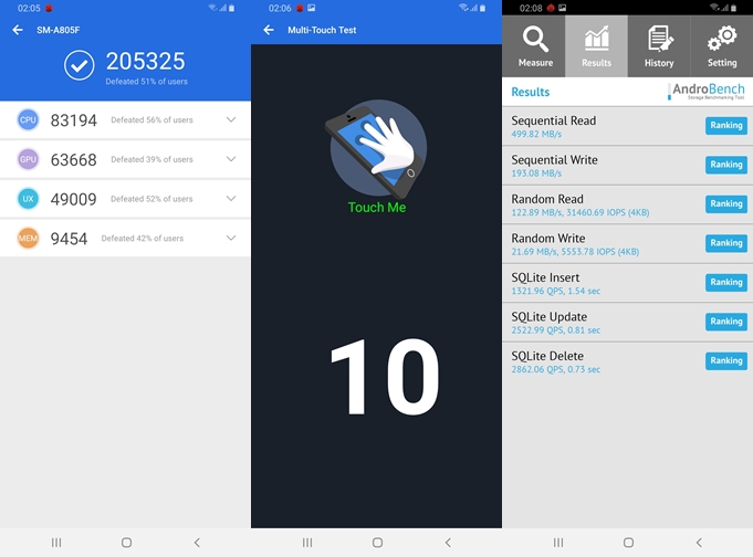 - ทดสอบด้วยแอปพลิเคชั่น AndroBench ทำความเร็วในการอ่านอยู่ที่ 499.82 MB/s (UFS 2.0 Storage)