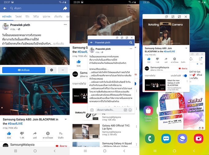 Multi Window (การแบ่งหน้าจอ) มีมาให้เหมือนเคยครับ แถมยังรองรับการแบ่งหน้าจอแบบ Pop-Up รวมทั้งย่อให้กลายเป็นไอค่อนได้ด้วยนะ และ อยากบอกว่าจัดเต็มแพรวพราวเหมือน Galaxy Note Series เลยครับ