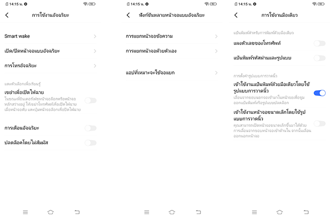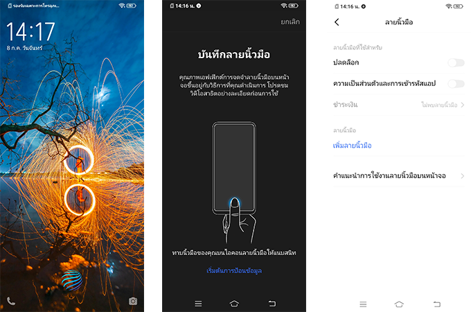อีกสิ่งหนึ่งที่เซอร์ไพรส์พอสมควรกับการใส่ระบบสแกนนิ้วมือบนหน้าจอมาให้ด้วย สำหรับการใช้งานจริงบอกได้เลยว่า หายห่วง สแกนได้ไวมาก แถมเราสามารถใช้ระบบสแกนนี้เป็นการยืนยันตัวตนสำหรับซื้อแอปพลิเคชั่นบน Google Play Store หรือแอปพลิเคชั่นอื่นๆ ได้ด้วยนะ สะดวกดีครับ และที่ชอบเลยคือเอฟเฟกต์ตอนสแกนยังคงความเท่ไว้เหมือนรุ่นพี่จริงๆ ซึ่งเราสามารถเลือกเปลี่ยนเอฟเฟกต์ได้ด้วยนะ เปลี่ยนได้จากในเมนูการสแกนนิ้วเลย