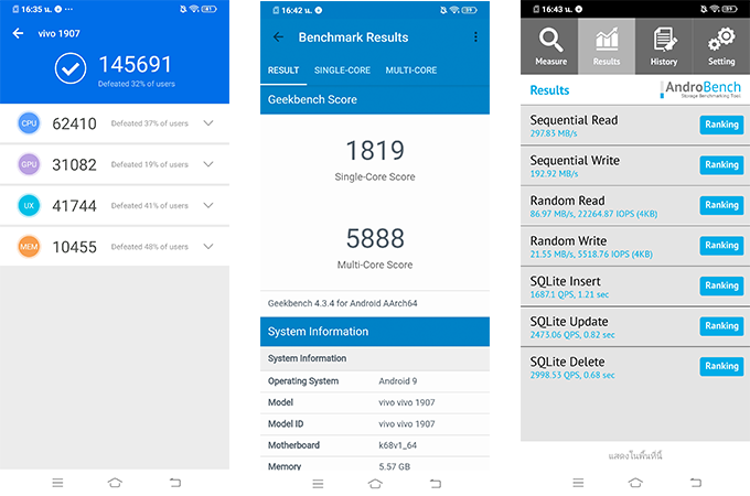 คะแนนทดสอบประสิทธิภาพการทำงานด้วยแอปพลิเคชั่น Benchmark