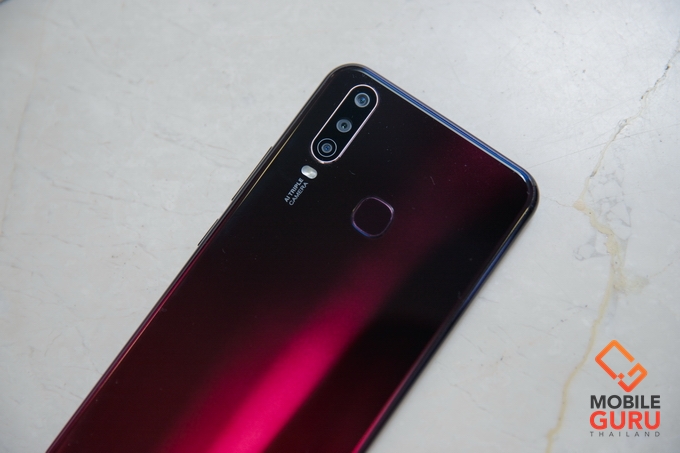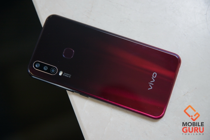 Vivo Y12 จะมีด้วยกัน 2 สี ซึ่งดีไซน์จะแตกต่างกันครับ Burgundy Red เป็นเป็นการไล่โทน ส่วนสี Aqua Blue ด้านหลังจะมีลวดลายแบบปริซึ่มสวยงาม สำหรับสีที่เรานำมารีวิวจะเป็น Burgundy Red ซึ่งผมว่าดูสวยมากๆ เลยครับ ดูพรีเมี่ยมเกินราคา ด้านหลังมาพร้อม AI Triple Camera กล้อง 3 ตัวประกอบด้วยความละเอียด 13MP F2.2 PDAF + 8MP F2.2 16 มม. (Ultrawide) + 2MP F2.4 Depth Sensor และไฟแฟลช LED ถัดมาตรงกลางจะเป็นเซ็นเซอร์สแกนลายนิ้วมือ ความแม่นยำและความรวดเร็วทำได้ดีมากครับ