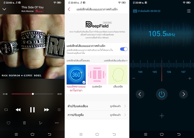 Vivo Y12 มาพร้อมฟีเจอร์ DeepField เป็นการปรับแต่งเสียงแบบพิเศษ ได้แก่ ระบบเสียง 360 องศา, เบสหนักๆ และเน้นเสียงร้อง นอกจากนี้ยังสามารถปรับแต่ง Equalizer ได้เอง และมีวิทยุมาให้ครับ สามารถบันทึกเสียงได้ จากการทดสอบถือว่าเป็นสมาร์ทโฟนที่เสียงดีไม่เลวเลยครับ