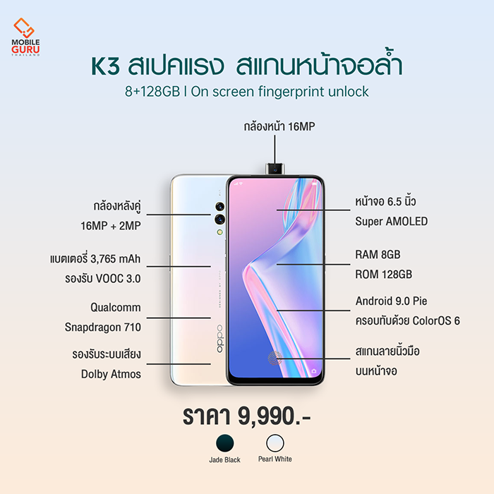 OPPO K3 สมาร์ทโฟนกระแสแรงจาก ออปโป้ ที่แอบย่องเข้ามาแบบไม่ทันตั้งตัว แถมยังเปิดตัวในราคาไม่ถึงหมื่นบาทอีกต่างหาก! ซึ่งในส่วนของสเปกก็เรียกว่าไม่ได้มาเล่นๆ นะ เพราะ OPPO K3 เขามาพร้อมคำขวัญประจำตัว "สเปกแรง สแกนหน้าจอล้ำ" ชูจุดเด่นชิปเซ็ต Snapdragon 710 ที่จับคู่กับความจำ RAM 8 GB และ ROM 128 GB พร้อมกล้องหน้าแบบ Rising Camera ให้หน้าจอไร้ขอบสมบูรณ์แบบ จอกว้าง ไร้ติ่งกวนใจ และระบบการสแกนลายนิ้วมือแบบใหม่ใต้หน้าจอ ที่สามารถปลดล็อกได้แม่นยำและรวดเร็วขึ้น แถมยังรองรับชาร์จไว VOOC Flash Charge 3.0 อีกด้วย