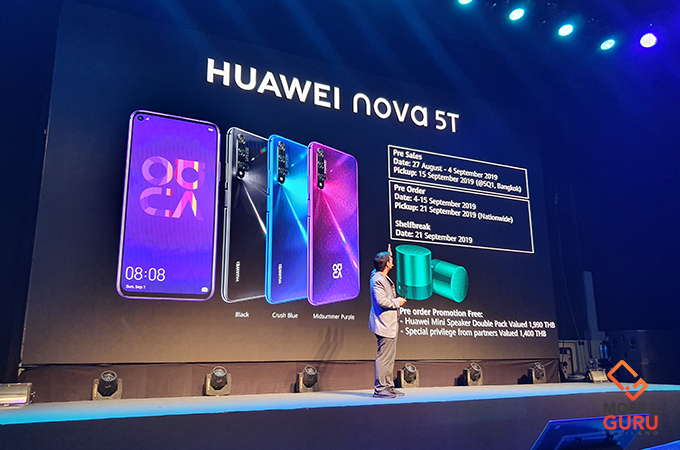 Huawei ประเทศไทย จะวางจำหน่าย Huawei Nova 5T ในวันที่ 21 กันยายน 2562 เป็นต้นไป ในราคา 10,990 บาท พร้อมสีตัวเครื่องให้เลือกทั้งหมด 3 สี คือ สีม่วง (Midsummer Purple), สีดำ (Black) และสีฟ้า (Crush blue) โดยจะมีกิจกรรมเปิดรับจองเครื่องแบบ Pre-Order ตั้งแต่วันที่ 4-15 กันยายน 2562 ซึ่งหากจองในช่วงพรีออเดอร์ก็จะได้รับของแถมเพิ่มเป็นลำโพงบลูทูธ Huawei Mini Bluetooth จำนวน 2 ชิ้น มูลค่า 1,990 บาท เริ่มรับเครื่องพร้อมวันวางจำหน่ายจริง
