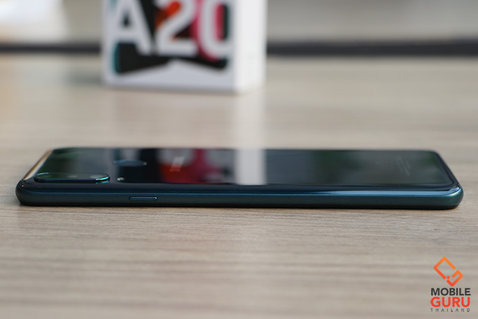 Samsung Galaxy A20s มาพร้อมด้วยดีไซน์ฝาหลังเรียบ เป็นมันเงา ให้เฉดสีที่แตกต่างเมื่อกระทบกับแสง ดูสวยงามมีมิติ มีให้เลือกทั้งหมด 3 สี คือ สีดำ (Black), สีแดง (Red) และสีที่ได้รับมาทดสอบการใช้งานในวันนี้... สีเขียว (Green) โดยในส่วนของด้านหลังตัวเครื่อง มาพร้อมกล้องหลัง 3 ตัว ประกอบด้วย กล้องหลักความละเอียด 13 ล้านพิกเซล ค่ารูรับแสงกว้าง f/1.8 + กล้อง Ultra Wide 120 องศา ความละเอียด 8 ล้านพิกเซล ค่ารูรับแสงกว้าง f/2.2 และกล้อง Depth ความละเอียด 5 ล้านพิกเซล ค่ารูรับแสงกว้าง f/2.2 โดยวางเรียงกันในแนวตั้ง นูนออกจากฝาหลังเล็กน้อย ถัดลงมาใต้กล้องเป็นไฟแฟลช LED และมีเซ็นเซอร์สำหรับสแกนลายนิ้วมือ พร้อมโลโก้ SAMSUNG สีเงินอยู่ตรงกลาง