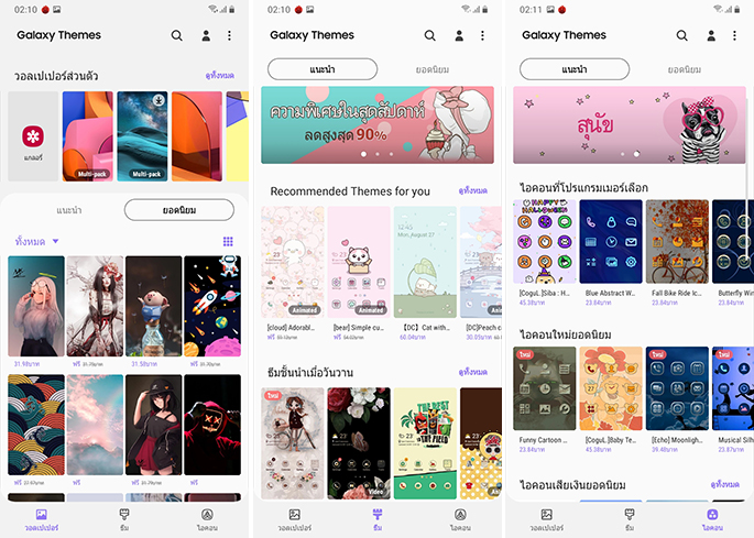 หน้ารวมธีม, วอลเปเปอร์, และไอคอนต่าง ๆ ที่มีให้เลือกทั้งแบบฟรีและแบบเสียเงิน