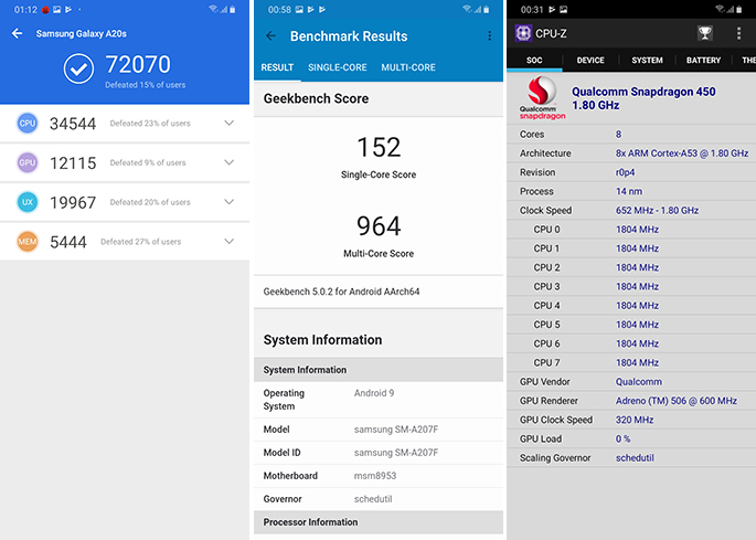Samsung Galazy A20s ใช้ชิปเซ็ตประมวลผล Qualcomm Snapdragon 450, Octa-core ความเร็ว 1.8 GHz ทำงานร่วมกับชิปประมวลผลกราฟิก Adreno 506 พร้อมความจำ RAM ขนาด 3 GB จับคู่กับ ROM 32 GB และความจำ RAM 4 GB จับคู่กับ ROM 64 GB สามารถใช้งานพื้นฐานโดยทั่วไปได้ดี ทั้งฟังเพลง, ดู Youtube, เล่น Facebook และใช้โปรแกรมแชท แต่อาจไม่เหมาะนักสำหรับการใช้งานที่กินสเปกหนัก ๆ และสำหรับการเปิดใช้งานหลาย ๆ แอปฯ ก็จะมีอาการค้างและเด้งออกอยู่เหมือนกัน